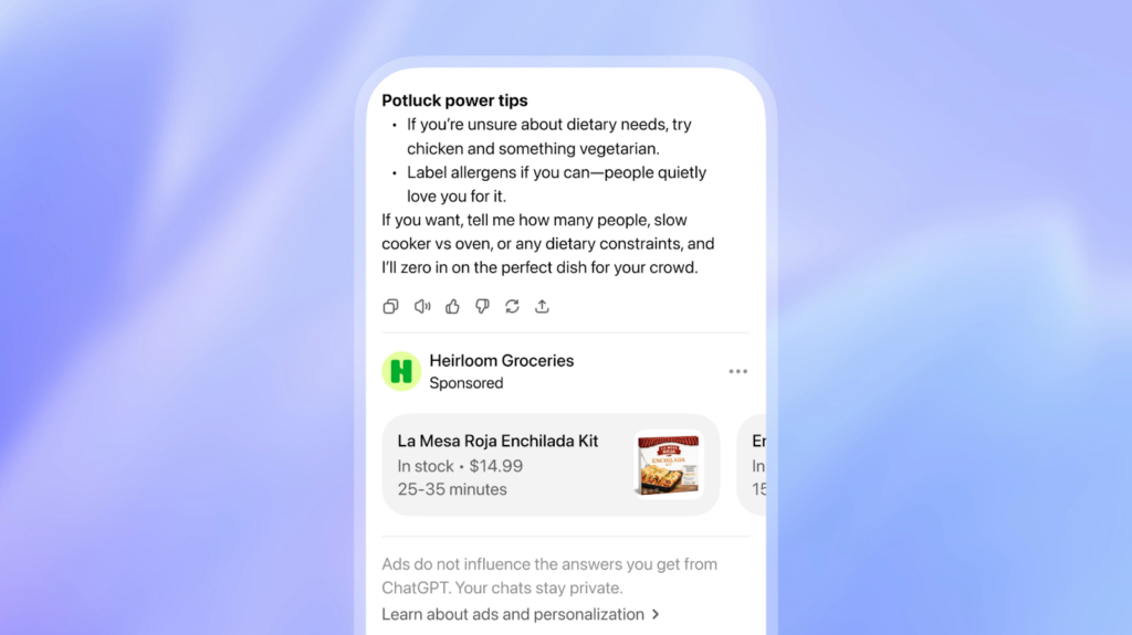 Early examples show ads appearing within the AI’s response itself, often integrated into informational answers rather than purely commercial queries. Instead of responding to explicit purchase intent, the system may surface sponsored options while a user is researching, learning, or exploring a topic.