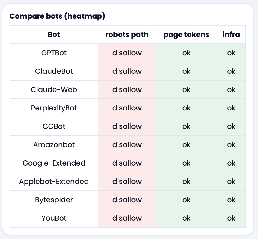 See if the site’s robots file blocks or allows each major LLM crawler, including path-level analysis for the exact page you tested. - Page-level directives