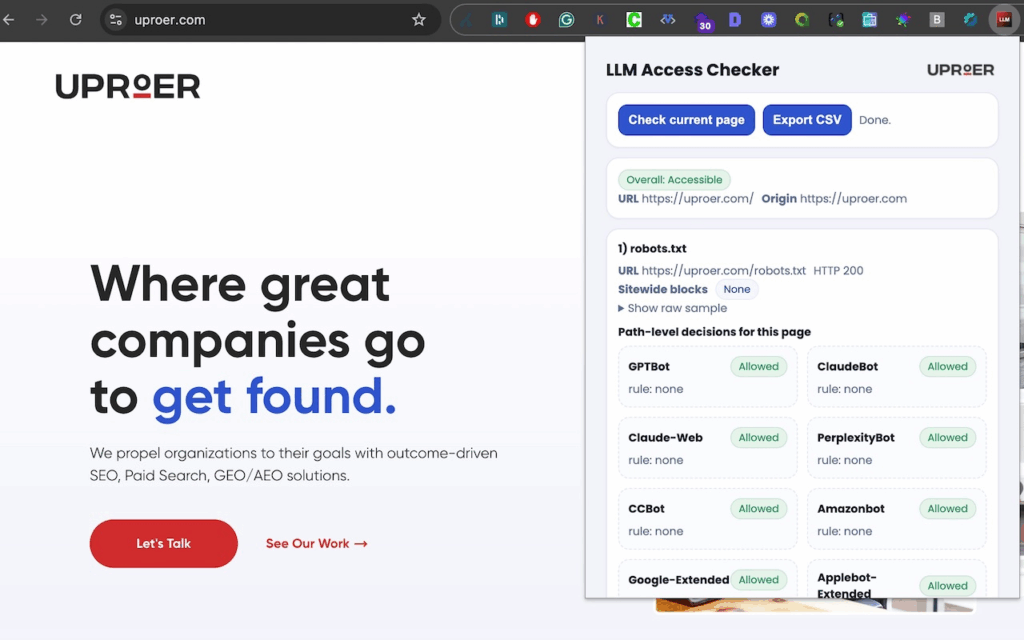 The LLM Access Checker Chrome extension gives you clear visibility into how your site looks to LLM crawlers. With easy-to-read reports, caching, and CSV export, it helps you stay ahead in the AI-powered search era.